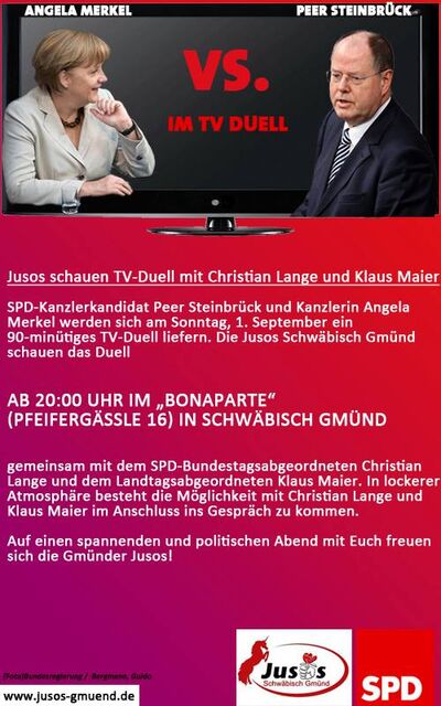 SPD-Kanzlerkandidat Peer Steinbrück und Kanzlerin Angela Merkel werden sich am Sonntag, 1. September ein 90-minütiges TV-Duell liefern. Die Jusos Schwäbisch Gmünd schauen das Duell ab 20:00 Uhr im „Bonaparte“ (Pfeifergässle 16) in Schwäbisch Gmünd gemeinsam mit dem SPD-Bundestagsabgeordneten Christian Lange dem Landtagsabgeordneten Klaus Maier an.